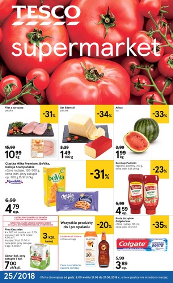 Nowa gazetka promocyjna sieci sklepów Tesco. Polecane promocje z gazetki Tesco: Filet z kurczaka 1 kg - 10,99 zł. Ser Edamski 100 g - 1,49 zł. Arbuz 1 kg - 1,99 zł. Oferta ważna…
