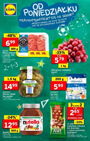 {loadposition linkLidl1} 'Od poniedziałku przygotowujemy się do szkoły' - nowa gazetka promocyjna sieci sklepów Lidl. Polecane promocje z gazetki sklepów Lidl: Winogrona czerwone 1 kg - 5,79 zł. Zielone oliwki bez pestek Eridanous 1,6 kg - 14,99 zł.…