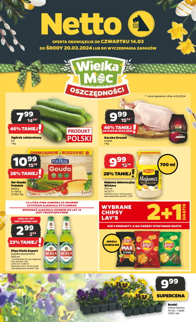 {loadposition linkNetto} 'Wielka Moc Oszczędności' - nowa gazetka promocyjna sieci sklepów Netto. Polecane promocje z gazetki Netto: Ogórek szklarniowy 1 kg - 7,99 zł. Ser Gouda Polmlek 2x250 g - 10,99 zł. Majonez dekoracyjny Winiary 700 ml - 9,99…