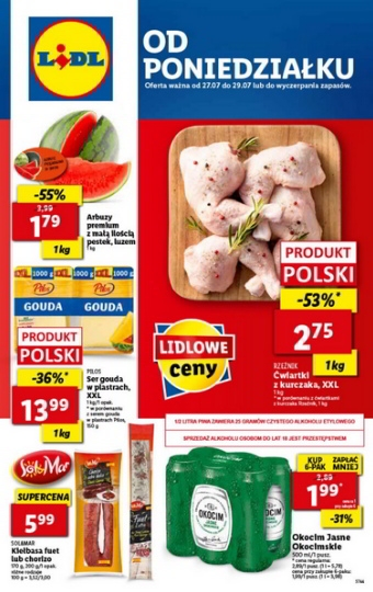 {loadposition linkLidl1} 'Od poniedziałku' - nowa gazetka promocyjna sieci sklepów Lidl. Polecane promocje z gazetki sklepów Lidl: Ćwiartki z kurczaka Rzeźnik 1 kg - 2,75 zł. Arbuz premium z małą ilością pestek 1 kg - 1,79 zł. Ser…
