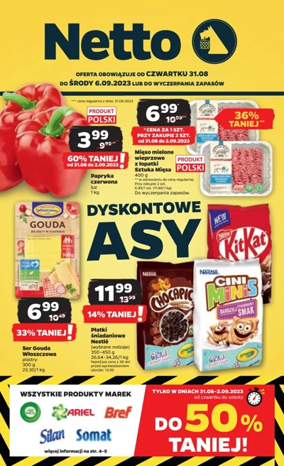 {loadposition linkNetto3} 'Dyskontowe asy' - nowa gazetka promocyjna sieci sklepów Netto. Polecane promocje z gazetki Netto: Papryka czerwona 1 kg - 3,99 zł*. Mięso mielone wieprzowe z łopatki Sztuka Mięsa 400 g - 6,99 zł**. Ser Gouda Włoszczowa w…
