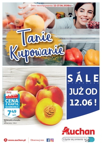 'Tanie kupowanie' - nowa gazetka promocyjna sieci marketów Auchan. Polecane promocje z gazetki Auchan: Nektarynki w koszyku 1 kg - 7,49 zł*. Ser sałatkowy Zottarella 125 g - 2,99 zł. Ser Kasztelan OSM Sierpc 1 kg - 18,99 zł.…