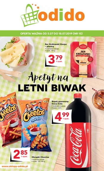 'Apetyt na letni biwak' - nowa gazetka promocyjna sklepów Odido. Polecane promocje z gazetki Odido: Ser Królewski Sierpc 135 g - 3,79 zł. Chrupki Cheetos wybrane smaki - 2,85 zł. Napój gazowany Coca-Cola 2,25 L - 2,25…