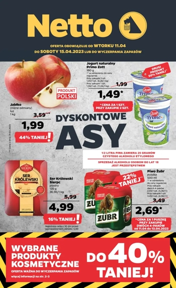 'Dyskontowe asy' - nowa gazetka promocyjna sieci sklepów Netto. Polecane promocje z gazetki Netto: Borówka 500 g - 9,99 zł. Ser Królewski Sierpc 135 g - 4,49 zł. Piwo Perła w butelce 500 ml - 2,99 zł. *…