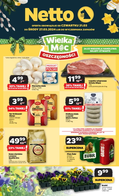 'Wielka Moc Oszczędności' - nowa gazetka promocyjna sieci sklepów Netto. Polecane promocje z gazetki Netto: Pieczarka biała 500 g - 4,99 zł*. Łopatka wieprzowa Sztuka Mięsa 1 kg - 11,99 zł**. Ser Królewski Sierpc 135 g - 3,99 zł.…