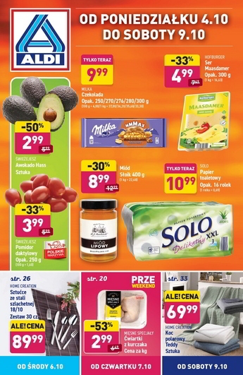 {loadposition linkAldi} Nowa gazetka promocyjna sieci sklepów Aldi. Polecane promocje z gazetki Aldi: Czekolada Milka 300 g - 9,99 zł. Ser Maasdamer Hofburger 300 g - 4,99 zł. Miód lipowy 400 g - 8,99 zł. Oferta ważna…