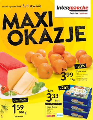 {loadposition linkIntermarche} 'Maxi okazje' - nowa gazetka promocyjna sieci sklepów Intermarche Polecane promocje z gazetki Intermarche: Ser Morski 100 g - 1,59 zł. Pomarańcze 1 kg - 3,99 zł. Masło Ekstra Ulubione 3x200 g - 9,99 zł. …