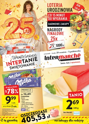 {loadposition linkIntermarche} '25 lat szczęśliwych zakupów' - nowa gazetka promocyjna sieci sklepów Intermarche Polecane promocje z gazetki Intermarche: Czekolada Milka 2x300 g - 19,98 zł. Ser Morski 100 g - 2,69 zł. Zupa Amino wybrane rodzaje - 1,76 zł.…
