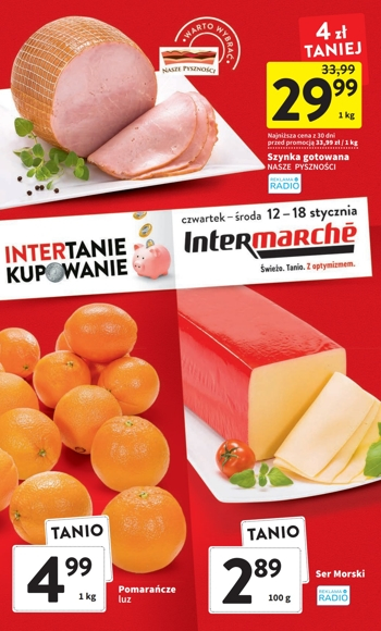 {loadposition linkIntermarche2} 'Intertanie kupowanie' - nowa gazetka promocyjna sieci sklepów Intermarche Polecane promocje z gazetki Intermarche: Szynka gotowana Nasze Pyszności 1 kg - 29,99 zł. Pomarańcze 1 kg - 4,99 zł. Ser Morski 100 g - 2,89 zł. …