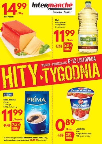 {loadposition linkIntermarche} 'Hity tygodnia' - nowa gazetka promocyjna sieci sklepów Intermarche. Polecane promocje z gazetki Intermarche: Ser Morski 1 kg - 14,99 zł. Olej rzepakowy Wielkopolski 3 L - 11,99 zł. Kawa mielona Prima Finezja 500…
