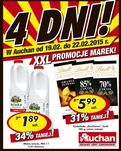 {loadposition linkAuchan} Nowa gazetka promocyjna Auchan - "XXL promocje marek!". Polecane promocje z gazetki Auchan: Mleko świeże 1 L - 1,89 zł. Czekolada Excellence Lindt 100 g - 5,99 zł. Ser Morski 1 kg - 11,79 zł. Oferta…