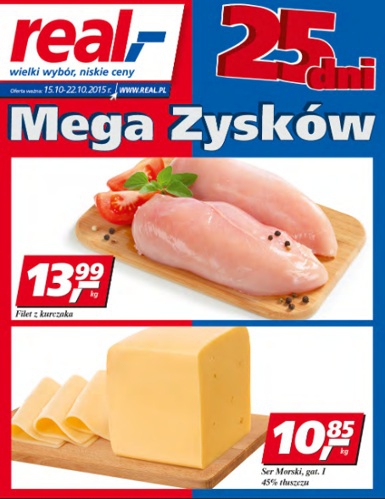 Nowa gazetka promocyjna sieci handlowej Real - "25 dni Mega Zysków". Polecane promocje z gazetki Real: Filet z kurczaka 1 kg - 13,99 zł. Ser Morski 1 kg - 10,85 zł. Pasta do zębów Colgate Herbal 2x125 ml…