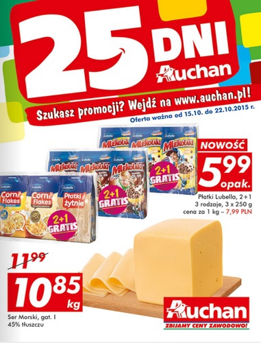 {loadposition linkAuchan} Nowa gazetka promocyjna Auchan - "25 dni Auchan". Polecane promocje z gazetki Auchan: Płatki Lubella 3x250 g - 5,99 zł. Ser Morski 1 kg - 10,85 zł. Mydło w płynie Luksja 2x400 ml - 4,70 zł. …