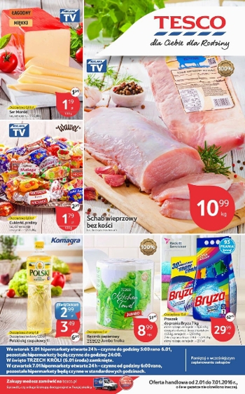 Nowa gazetka promocyjna Tesco. Polecane promocje z gazetki Tesco: Ser Morski 100 g - 1,19 zł. Schab wieprzowy bez kości 1 kg - 10,99 zł. Proszek do prania Bryza 7 kg - 29,99 zł. Oferta ważna od…