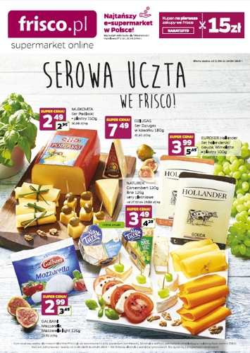 Nowa gazetka promocyjna supermarketu internetowego Frisco.pl - "Serowa uczta!". Polecane promocje z gazetki Frisco.pl: Ser Podlaski Mlekovita w plastrach 150 g - 2,4 zł. Ser Dziugas w kawałku 180 g - 7,49 zł. Ser holenderski Hollander w plastrach…