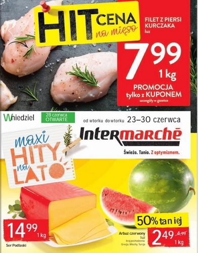 {loadposition linkIntermarche2} 'Maxi hity na lato' - nowa gazetka promocyjna sieci sklepów Intermarche Polecane promocje z gazetki Intermarche: Filet z piersi kurczaka 1 kg - 7,99 zł*. Ser Podlaski 1 kg - 14,99 zł. Arbuz czerwony 1…