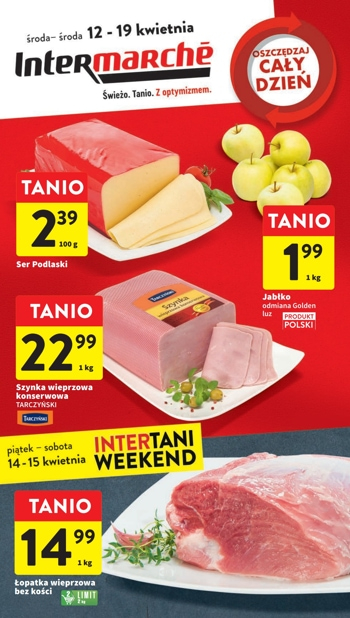 {loadposition linkIntermarche} 'Oszczędzaj cały dzień' - nowa gazetka promocyjna sieci sklepów Intermarche Polecane promocje z gazetki Intermarche: Ser Podlaski 100 g - 2,39 zł. Jabłka odmiana Golden 1 kg - 1,99 zł. Szynka wieprzowa konserwowa Tarczyński 1 kg -…