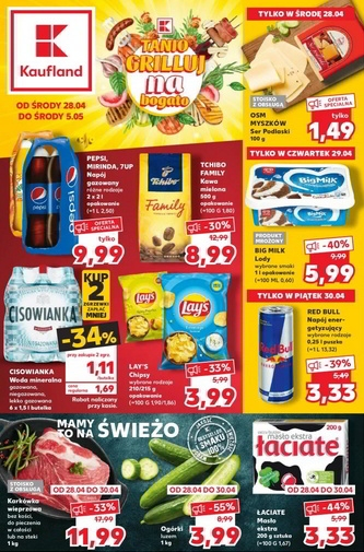 {loadposition linkKaufland2} 'Tanio grilluj na bogato' - nowa gazetka promocyjna sieci marketów Kaufland. Polecane promocje z gazetki Kaufland: Ser Podlaski OSM Myszków 100 g - 1,49 zł*. Lody Big Milk Algida 1 L - 5,99 zł**. Napój energetyzujący Red…