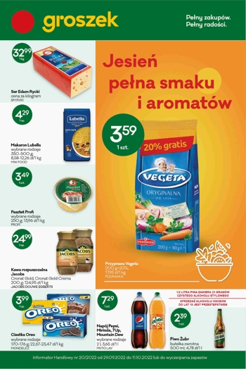 {loadposition linkGroszek} 'Jesień pełna smaku i aromatów' - nowa gazetka promocyjna sieci sklepów Groszek. Polecane promocje z gazetki Groszek: Przyprawa Vegeta Podravka 240 g - 3,59 zł. Ser Rycki Edam SM Ryki 1 kg - 32,99 zł. Makaron Lubella…