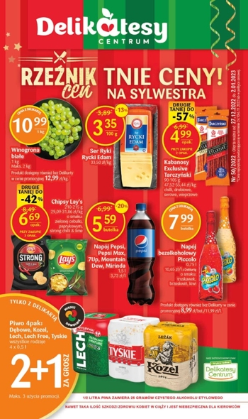 {loadposition linkDelikatesyCentrum4} 'Rzeźnik cen tnie ceny na Sylwestra!' - nowa gazetka promocyjna Delikatesów Centrum. Polecane promocje z gazetki Delikatesów Centrum: Winogrona białe 1 kg - 10,99 zł*. Ser Rycki Edam Ryki 100 g - 3,35 zł. Kabanosy Exclusive Tarczyński…