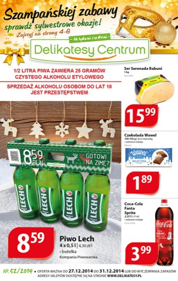{loadposition linkDelikatesyCentrum} Nowa gazetka promocyjna Delikatesów Centrum. Polecane promocje z gazetki Delikatesów Centrum: Piwo Lech 4x500 ml - 8,59 zł. Ser Serenada Babuni 1 kg - 15,99 zł. Czekolada Wawel 100 g - 1,89 zł. Oferta ważna od…