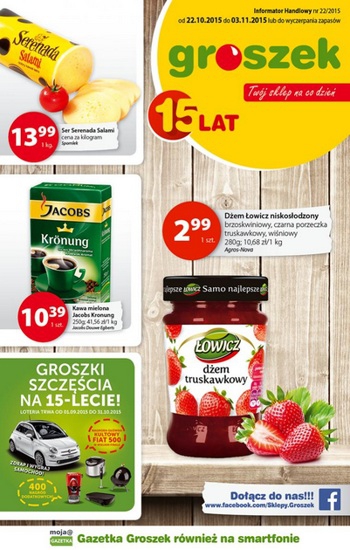 {loadposition linkGroszek} Nowa gazetka promocyjna sieci handlowej Groszek. Polecane promocje z gazetki Groszek: Dżem Łowicz niskosłodzony 280 g - 2,99 zł. Ser Serenada Babuni 1 kg - 13,99 zł. Kawa mielona Jacobs Kronung 250 g - 10,39 zł. …