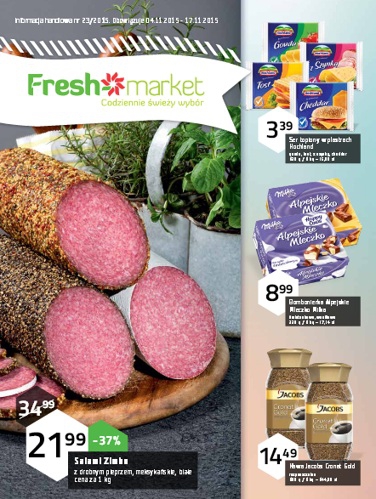 {loadposition linkFreshmarket} Nowa gazetka promocyjna Freshmarket. Polecane promocje z gazetki Freshmarket: Salami Zimbo 1 kg - 21,99 zł. Ser topiony w plastrach Hochland 130 g - 3,39 zł. Bombonierka Alpejskie Mleczko Milka 330 g - 8,99 zł. Oferta…
