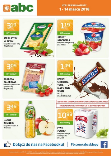 Nowa gazetka promocyjna sieci sklepów ABC. Polecane promocje z gazetki ABC: Ser w plastrach Gouda Mlekpol 150 g - 3,19 zł. Jogurt Jogobella 150 g - 1,19 zł. Napój Tymbark 2 L - 3,49 zł. …