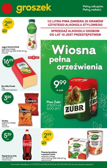 {loadposition linkGroszek} 'Wiosna pełna orzeźwienia' - nowa gazetka promocyjna sieci sklepów Groszek. Polecane promocje z gazetki Groszek: Piwo Żubr 4x500 ml - 9,99 zł. Ser żółty Gouda Mleczna Zagroda 1 kg - 16,99 zł. Chipsy Doritos 100 g -…