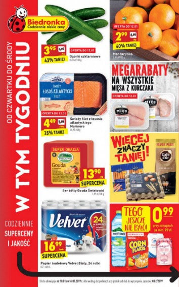 {loadposition linkBiedronka2} 'W tym tygodniu' - nowa gazetka promocyjna sieci sklepów Biedronka. Polecane promocje z gazetki sieci Biedronka: Mandarynki 1 kg - 2,99 zł. Ser żółty Gouda Światowid 1 kg - 13,90 zł. Papier toaletowy Velvet Biały 24…