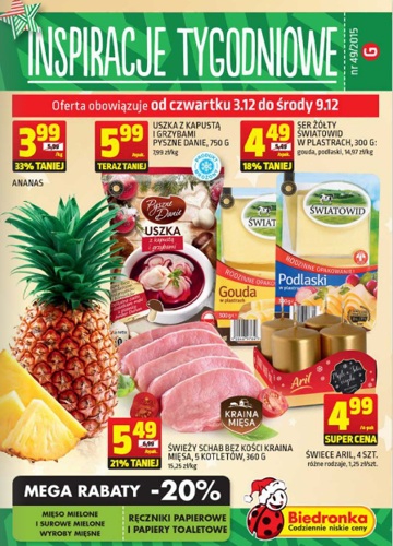 {loadposition linkBiedronka} Nowa gazetka promocyjna sieci handlowej Biedronka - "Inspiracje Tygodniowe". Polecane promocje z gazetki sieci Biedronka: Ananas 1 kg - 3,99 zł. Świece Aril 4 sztuki - 4,99 zł. Ser żółty Światowid w plastrach 300 g - 4,49…