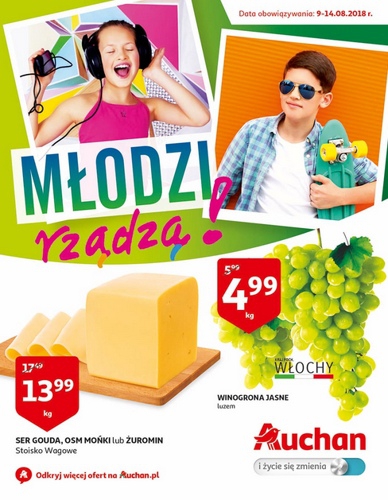 {loadposition linkAuchan} 'Młodzi rządzą!' - nowa gazetka promocyjna sieci marketów Auchan. Polecane promocje z gazetki Auchan: Ser Gouda 1 kg - 13,99 zł. Winogrona jasne 1 kg - 4,99 zł. Ogórki małosolne 2x340 g - 4,20 zł. …
