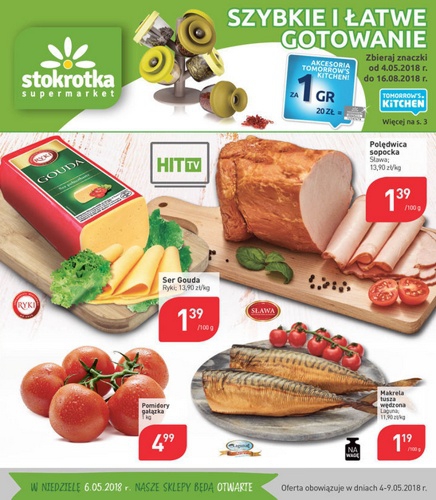 'Szybkie i łatwe gotowanie' - nowa gazetka promocyjna sieci sklepów Stokrotka. Polecane promocje z gazetki Stokrotka: Ser Gouda Ryki 100 g - 1,39 zł. Polędwica sopocka Sława 100 g - 1,39 zł. Makrela tusza wędzona Laguna 100…