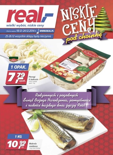 Nowa gazetka promocyjna sieci handlowej Real - "Niskie ceny pod choinkę". Polecane promocje z gazetki Real: Pierogi U Jędrusia 1 kg - 7,79 zł. Makrela wędzona 1 kg - 10,99 zł. Ser Podlaski 1 kg - 12,99 zł.…