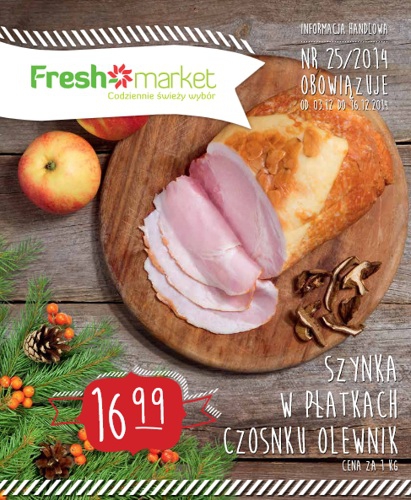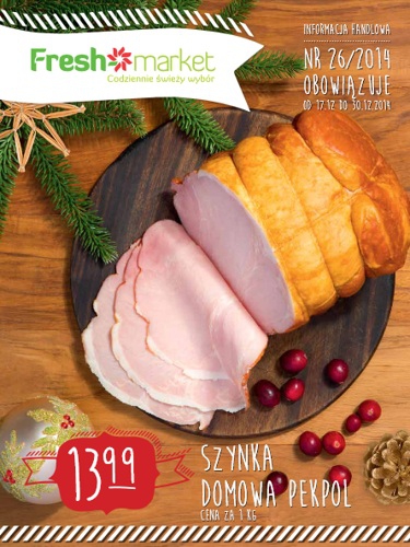 {loadposition linkFreshmarket} Nowa gazetka promocyjna Freshmarket. Polecane promocje z gazetki Freshmarket: Szynka domowa Pekpol 1 kg - 13,99 zł. Udziec wołowy 1 kg - 25,99 zł. Ser Gouda Mlekovita 1 kg - 15,99 zł. Oferta ważna od 17.12…