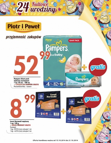 Urodzinowa gazetka promocyjna sieci sklepów Piotr i Paweł - "24 kultowe urodziny". Polecane promocje z gazetki Piotr i Paweł: Pieluchy Pampers Giant Pack + chusteczki - 52,99 zł. Łosoś norweski wędzony 2x100 g - 8,99 zł. Ser Królewski…