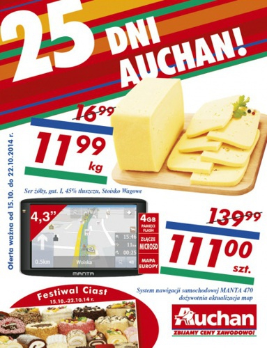 {loadposition linkAuchan} Nowa gazetka promocyjna Auchan - "25 dni Auchan!". Polecane promocje z gazetki Auchan: Ser żółty 1 kg - 11,99 zł. System nawigacji samochodowej Manta 470 - 111 zł. Kiełbasa śląska Henryk Kania 2x600 g - 9,96 zł.…
