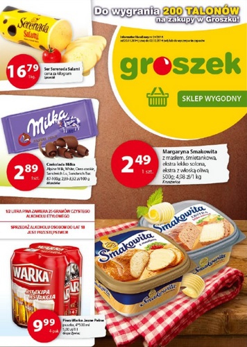 {loadposition linkGroszek} Nowa gazetka promocyjna sieci handlowej Groszek. Polecane promocje z gazetki Groszek: Ser Serenada Salami 1 kg - 16,79 zł. Czekolada Milka 100 g - 2,89 zł. Margaryna Smakowita 500 g - 2,49 zł. Oferta ważna od…