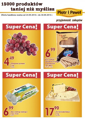 Nowa gazetka promocyjna sieci sklepów Piotr i Paweł - "15 000 produktów taniej niż myślisz". Polecane promocje z gazetki Piotr i Paweł: Winogrono czerwone 1 kg - 4,49 zł. Jaja z wolnego wybiegu Farmio klasa L 10 sztuk…