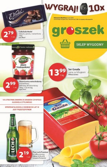 {loadposition linkGroszek} Nowa gazetka promocyjna sieci handlowej Groszek. Polecane promocje z gazetki Groszek: Ser Gouda 1 kg - 13,99 zł. Czekolada Wedel 100 g - 2,79 zł. Piwo Lech Premium 500 ml - 2,19 zł. Oferta ważna od…