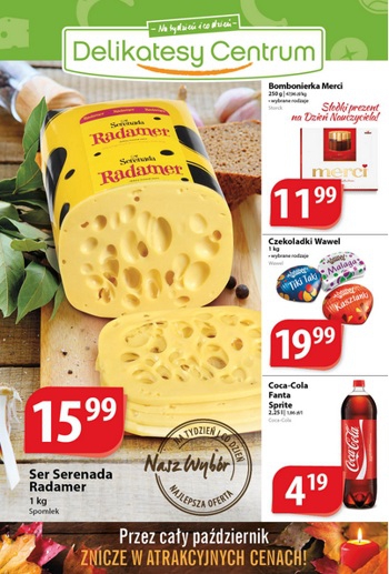 {loadposition linkDelikatesyCentrum} Nowa gazetka promocyjna Delikatesów Centrum. Polecane promocje z gazetki Delikatesów Centrum: Ser Serenada Radamer 1 kg - 15,99 zł. Bombonierka Merci 250 g - 11,99 zł. Czekoladki Wawel 1 kg - 19,99 zł. Oferta ważna od…
