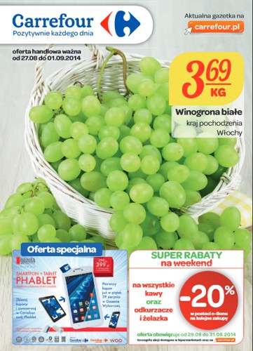 {loadposition linkCarrefour} Nowa gazetka promocyjna sieci handlowej Carrefour. Polecane promocje z gazetki Carrefour: Winogrono białe 1 kg - 3,69 zł. Ser żółty Morski 1 kg - 16,99 zł. Chleb prowansalski 1 kg - 9,99 zł. Oferta ważna od…