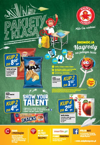 Nowa gazetka promocyjna Małpka Express - "Pakiet z klasą". Polecane promocje z gazetki Małpka Express: Lizak Chupa Chups 2x12 g - 1,50 zł. Baton Dumle Snacks 2x40 g - 4 zł. Ser Serenada 2x150 g - 7 zł.…