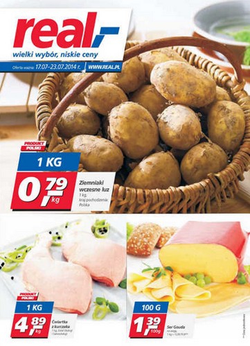 Nowa gazetka promocyjna sieci handlowej Real. Polecane promocje z gazetki Real: Ziemniaki wczesne 1 kg - 0,79 zł. Ćwiartka z kurczaka 1 kg - 4,89 zł. Ser Gouda 100 g - 1,39 zł. Oferta ważna od 17.07…