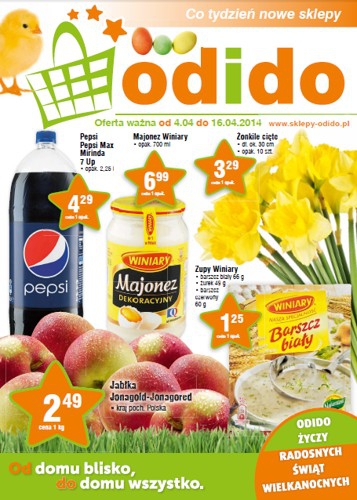 Nowa gazetka promocyjna sklepów Odido. Polecane promocje z gazetki Odido: Majonez Winiary 700 ml - 6,99 zł. Ser żółty Mlekovita 500 g - 9,49 zł. Kiełbasa Żywiecka Krakus 286 g - 6,79 zł. Oferta ważna od 4.04…