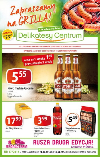 {loadposition linkDelikatesyCentrum} Nowa gazetka promocyjna Delikatesów Centrum - "Zapraszamy na grilla". Polecane promocje z gazetki Delikatesów Centrum: Piwo Tyskie 3x500 ml - 5,55 zł. Ser Złoty Mazur 1 kg - 17,99 zł. Węgiel drzewny 2,75 kg - 5,49 zł.…