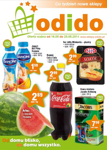 Nowa gazetka promocyjna sklepów Odido. Polecane promocje z gazetki Odido: Jogurt Ale Pitny Danone 300 g - 1,59 zł. Ser żółty Mlekovita 150 g - 2,99 zł. Arbuz 1 kg - 2,89 zł. Oferta ważna od 16.05…
