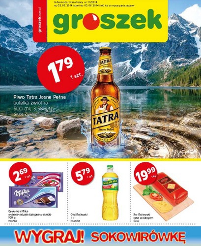 {loadposition linkGroszek} Nowa gazetka promocyjna sieci handlowej Groszek. Polecane promocje z gazetki Groszek: Piwo Tatra Jasne Pełne 500 ml - 1,79 zł. Czekolada Milka 100 g - 2,99 zł. Ser Królewski 1 kg - 19,99 zł. Oferta ważna…