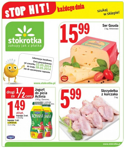 Nowa gazetka promocyjna sieci handlowej Stokrotka - "sTOP HIT!". Polecane promocje z gazetki Stokrotka: Ser Gouda 1 kg - 15,99 zł. Jogurt do picia Danone Activia 2x195 g - 2,98 zł. Skrzydełka z kurczaka 1 kg - 5,99…