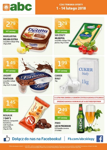 Nowa gazetka promocyjna sieci sklepów ABC. Polecane promocje z gazetki ABC: Margaryna Delma Extra 450 g - 2,79 zł. Ser żółty Mlekpol 150 g - 3,29 zł. Cukier biały 1 kg - 1,99 zł. Oferta…